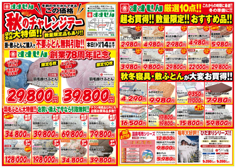 お知らせ一覧 すずぜん ホーム お知らせ一覧 お知らせ一覧 2025.09.27 令和7年9月号 秋のチャレンジデー 毎年恒例!秋のチャレンジデー開催! 店内商品チャレンジ価格にて大奉仕!… 2025.07.11 令和7年7月号 夏物クリアランスセール 高機能寝具で夏を乗り切ろう!店内商品大奉仕中! 早い者勝ちです! … 2025.06.16 令和7年6月号 羽毛リフォームキャンペーン 今お使いの羽毛ふとん、リフォームしませんか? 期間中最大400g足し羽… 2025.05.04 号外 羽毛ふとん丸洗いセール 大好評!羽毛ふとんまとめ洗いセール開催中! 羽毛ふとんのクリーニングが… 2025.04.26 令和7年4月号 大決算セール 年に一度の大決算セール開催中! クーポンで更にお得!普段お値引きできな… 2025.04.07 おふとんレンタル 快眠セットサービス開始!より快適な睡眠を! 厚さ9㎝ムアツスタンダードを使用した快眠セットサービスを開始しまし… 2025.03.24 号外 羽毛丸洗い特別セール 号外!羽毛丸洗い特別セール開始! 直営工場開設5周年を記念しまして羽毛… 2025.03.01 令和7年3月号 在庫一掃スーパーセール 店内在庫がとにかく安い! 羽毛ふとん、敷きふとん、冬物寝具ならすずぜん… 2024.12.25 年末年始おふとんレンタル完売のお知らせ年末年始おふとんレンタルですが、皆様のご好評により 完売いたしました。 誠にあり… 2024.12.14 令和6年12月号 すずぜんサンタのえこひいきSALE 毎年恒例の大人気セールが絶賛開催中! とってもおいしい割れせんべいをド… 2 / 6«12345...»最後 »